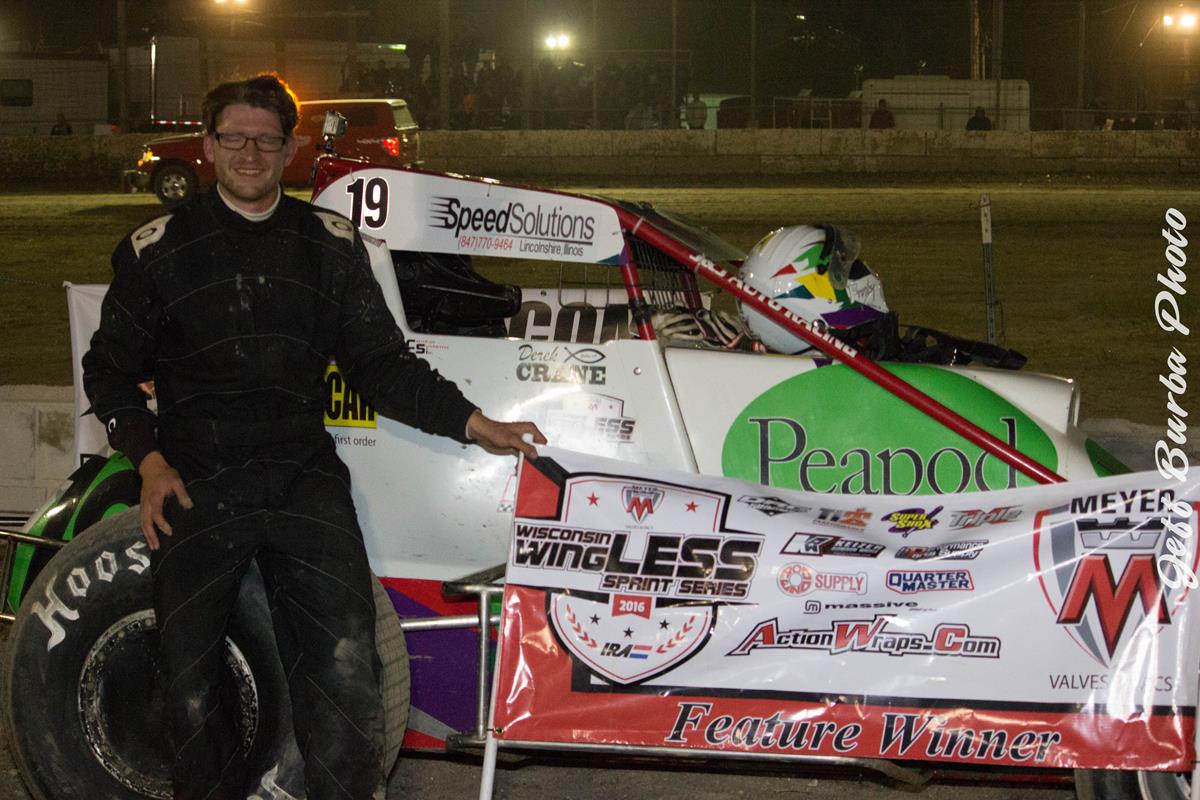 Once the racing settled, first year driver Derek Crane of Waukegan, Illinois in just his second night behind the wheel of the non-winged sprint car had the former go-kart racer lead wire to wire to score his first feature win. Allen Hafford of Beach Park, IL was second, Kenosha's Matt White third, Pleasant Prairie's Dan Wade fourth and Salem's George Gaertner Jr. fifth.