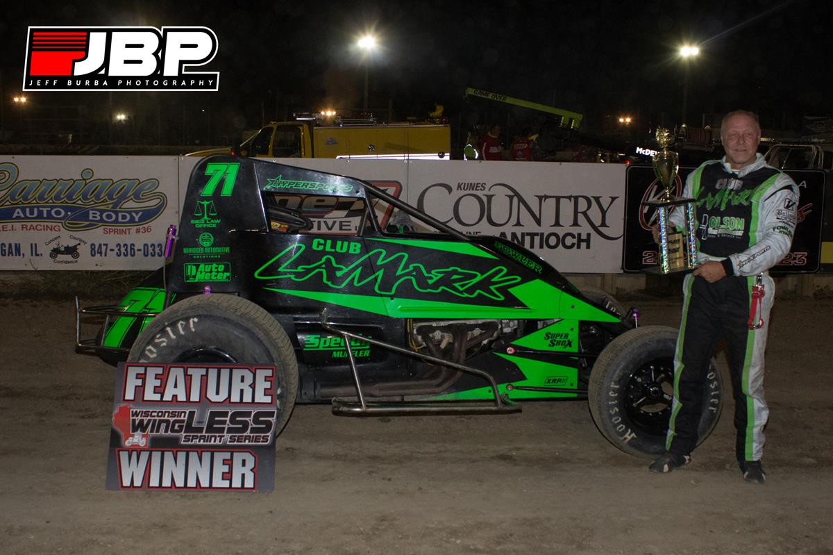 Cottage Grove's Doug Schenck scored a clean sweep capturing his second 20-lap wingLESS Sprints feature of the season at Wilmot, winning a 8-lap heat race and posting the fastest qualifying lap of the 23 cars on hand. Schenck took the lead from Nathan Crane of Waukegan, Illinois on lap 13 just prior to a caution for a spin and a red flag on the restart when Craig Campton of Milwaukee, who was running third, spun and flipped on the backstretch. Campton was not injured.