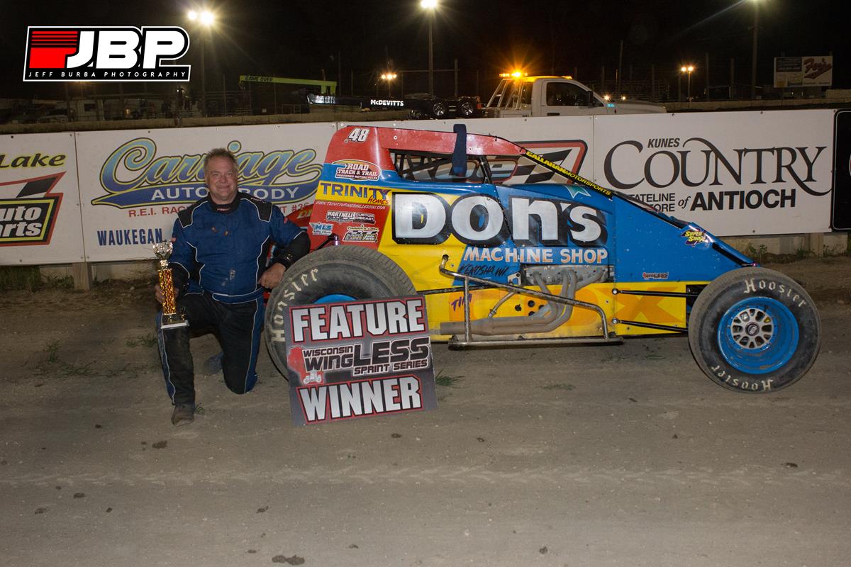 Tim Cox of Park City, Illinois captured his second 20-lap Wisconsin wingLESS Sprint feature of the season at Wilmot, with a little bit of being in the right place at the right time.