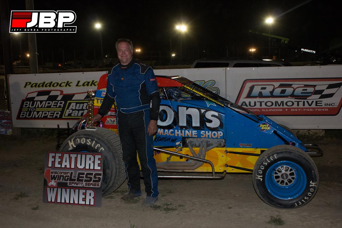 Tim Cox of Park City, Illinois chalked up his third 20-lap Wisconsin wingLESS Sprint feature of the season at Wilmot's third mile, and second in a row. A pair of early cautions kept the field within striking distance of Cox who led every lap. A late race yellow for Doug Schenck of Cottage Grove, who was running third at the time, spun backing his car into the wall coming out of turn two setting up a green-white checkered finish.