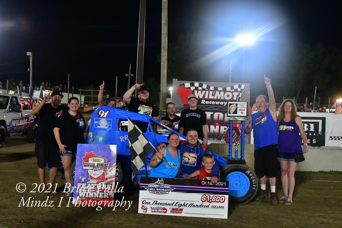 CJ Malueg and Jimmy Sivia started on the front row of the A main, in front of a packed Wilmot Raceway grandstand. Sivia took the early lead, while drivers starting mid to back of the A main began their marches to the front. perennial contenders Rusty Egan and Greg Olson drove from 7th and 11th respectively, onto podium positions, the pair challenged Sivia, but the Grand Appliance 91 proved to be too strong, claiming the victory worth $2,000 thanks to bonus money from sponsors. The top 5 was completed by Chris Klemko who started 12th and 14th starting Daniel Graumenz.