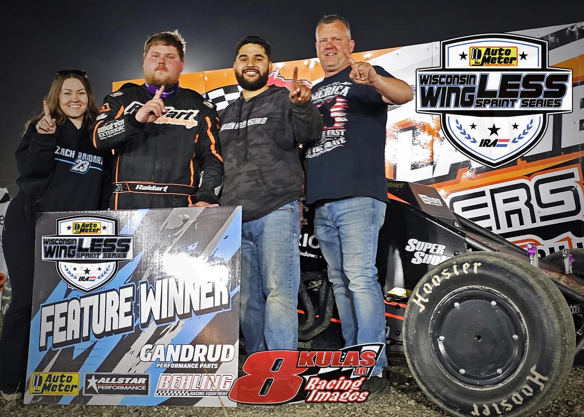 (Wilmot, Wis., Friday, May 30, 2025)--Zach Raidart of Gurnee, IL, defending AutoMeter Wisconsin WingLESS Sprints Powered By Gandrud Performance Champion, finally cracked the top 10, top five and win column all at once scoring a dominating victory in the 20-lap Border Battle with the American Sprint Car Tour Friday, May 30, at Wilmot Raceway.