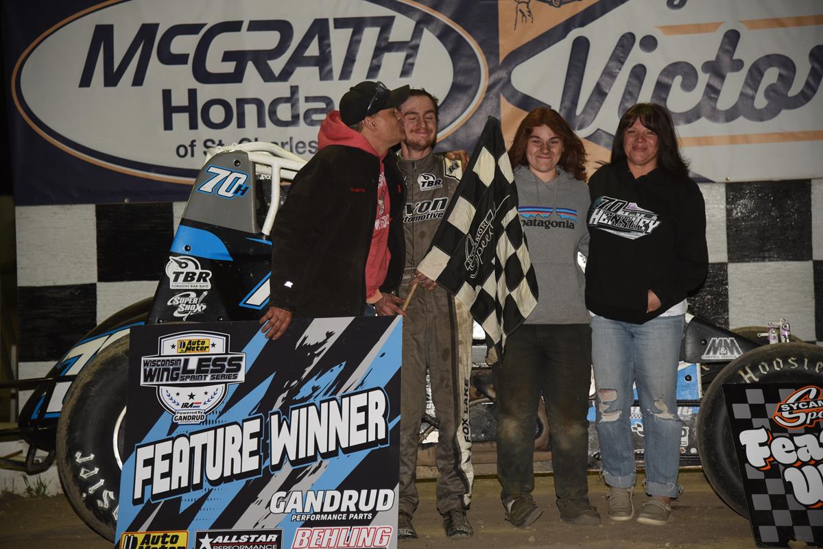 "This is awesome," said Trevor's Tate Hensley, second generation driver, after leading flag to flag in the 20-lap AutoMeter powered by Gandrud Performance Wisconsin WingLESS Sprints feature. "It wasn't easy as we caught up to lapped traffic, as I knew Zach (Raidart) was right there waiting for me to make a mistake. I kept hitting my marks and it came together for a win."