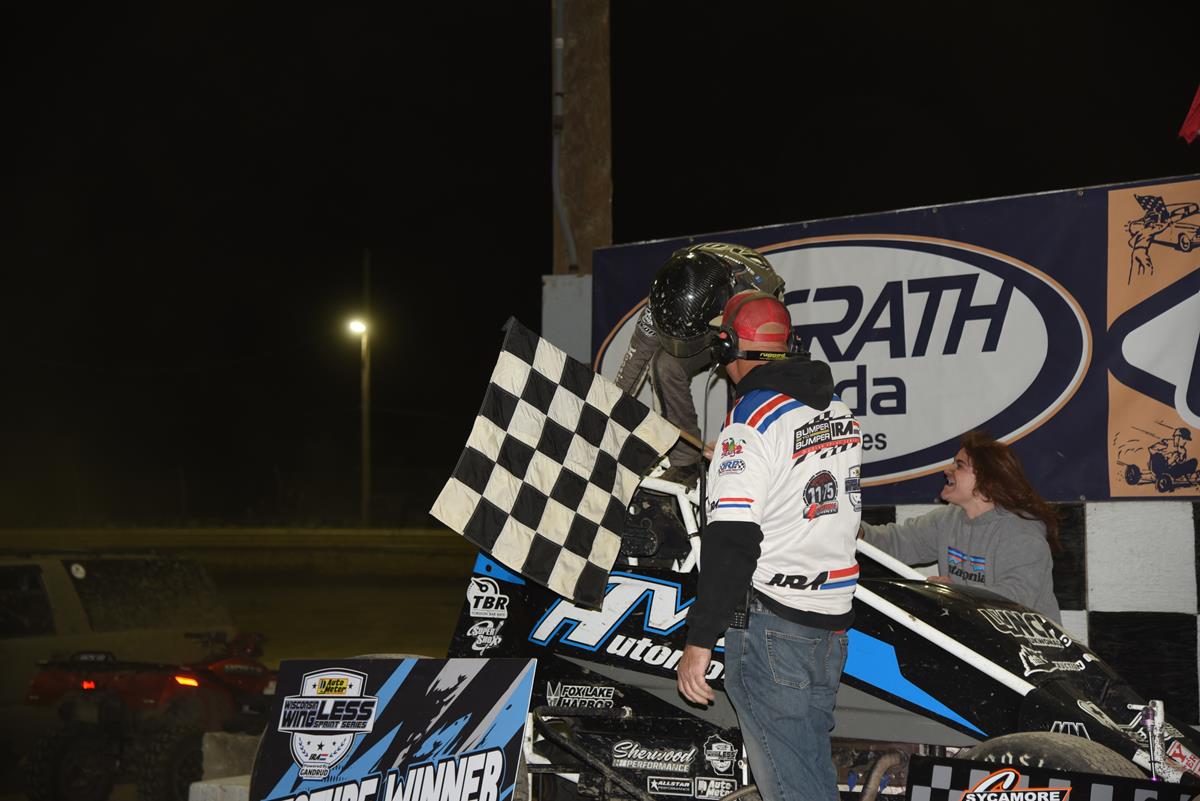 (Sycamore, IL, Saturday, May 31, 2025)--"It's not the way I wanted to win, but I guess we'll take it," said Brian Strane Jr. of Paris following his third consecutive 11-75 Sports Complex & Eatery IRA Lightning Sprints main in a row after taking top honors in the 20-lap feature at Sycamore(IL) Speedway Saturday, May 31, 2025.