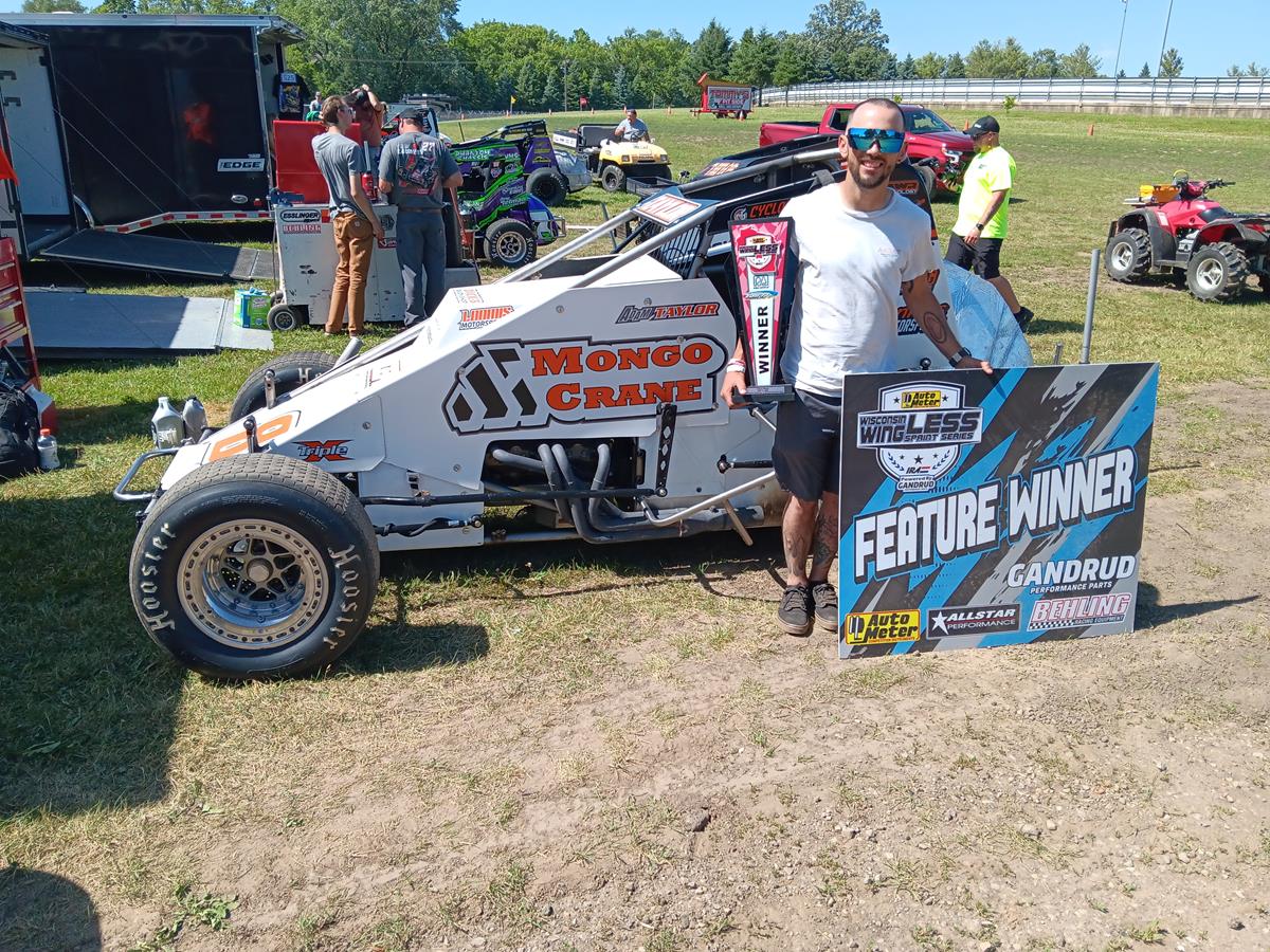 (Plymouth, WI, Saturday, June 21, 2025)--Adam Taylor of Whitfield, IN made it three in a row taking the 20-lap AutoMeter Powered by Gandrud Performance Wisconsin WingLESS Sprints feature portion of the Road America Challenge Saturday, June 21 at Plymouth Dirt Track on the Sheboygan County Fairgrounds.