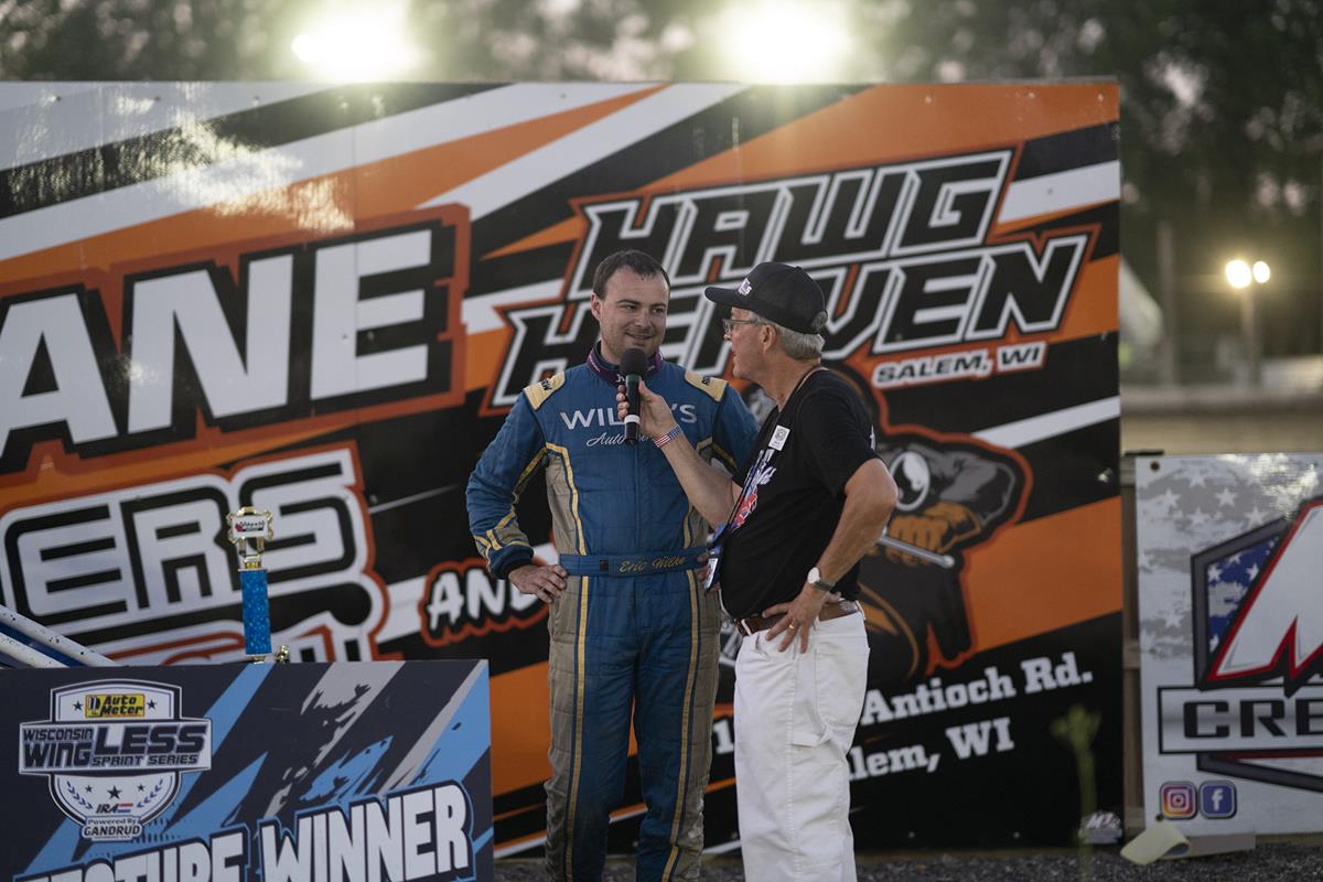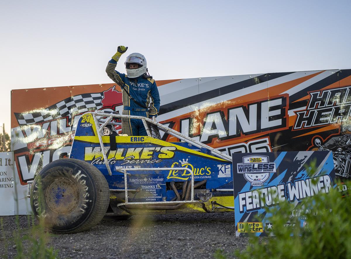(Wilmot, Wis., Tuesday, July 1, 2025)--Eric Wilke of Genesee first WIlmot Raceway AutoMeter Powered By Gandrud Performance Wisconsin WingLESS Sprints Series 20-lap feature win of the season on Carload & Fireworks Night Tuesday, July 1, 2025.