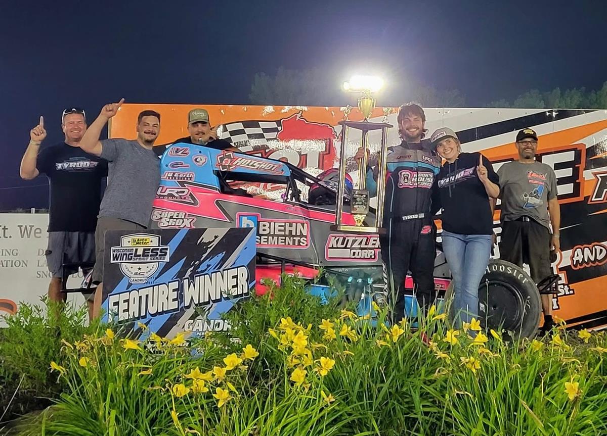 (Wilmot, Wis., Saturday, July 12, 2025)--Tyler Kuxhouse of Antioch, IL snapped a feature win drought extending back to last fall scoring the AutoMeter powered by Gandrud Performance Wisconsin WingLESS Sprints feature win of the 4th Annual Larry Hillerud Memorial Saturday, July 12, 2025 at Wilmot Raceway.